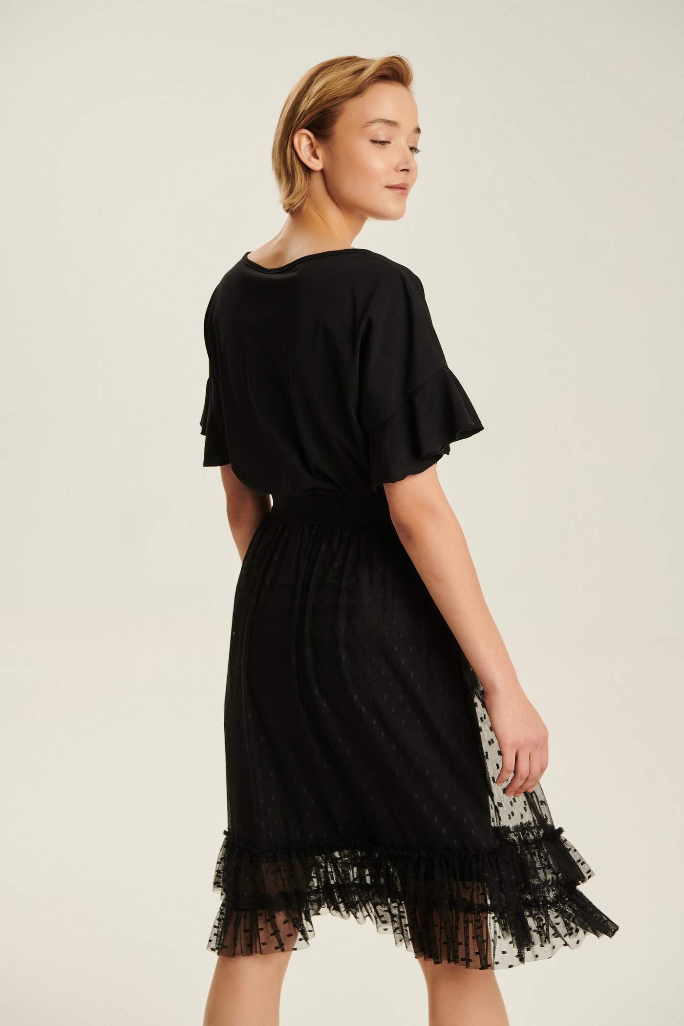 Tulle Black Polka Dot Skirt, with Elastic Waist. Made of 90% Polyester and 10% Elastane.
